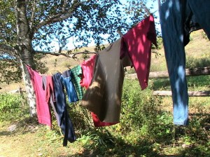 As the day passes, I peek out the window. The clothes are still there, waving away, like so many Tibetan prayer flags, honoring the earth. They are drying, all by themselves, without the sound of an electric motor. Without chemical odor. So much work is being done for so little. I love it.