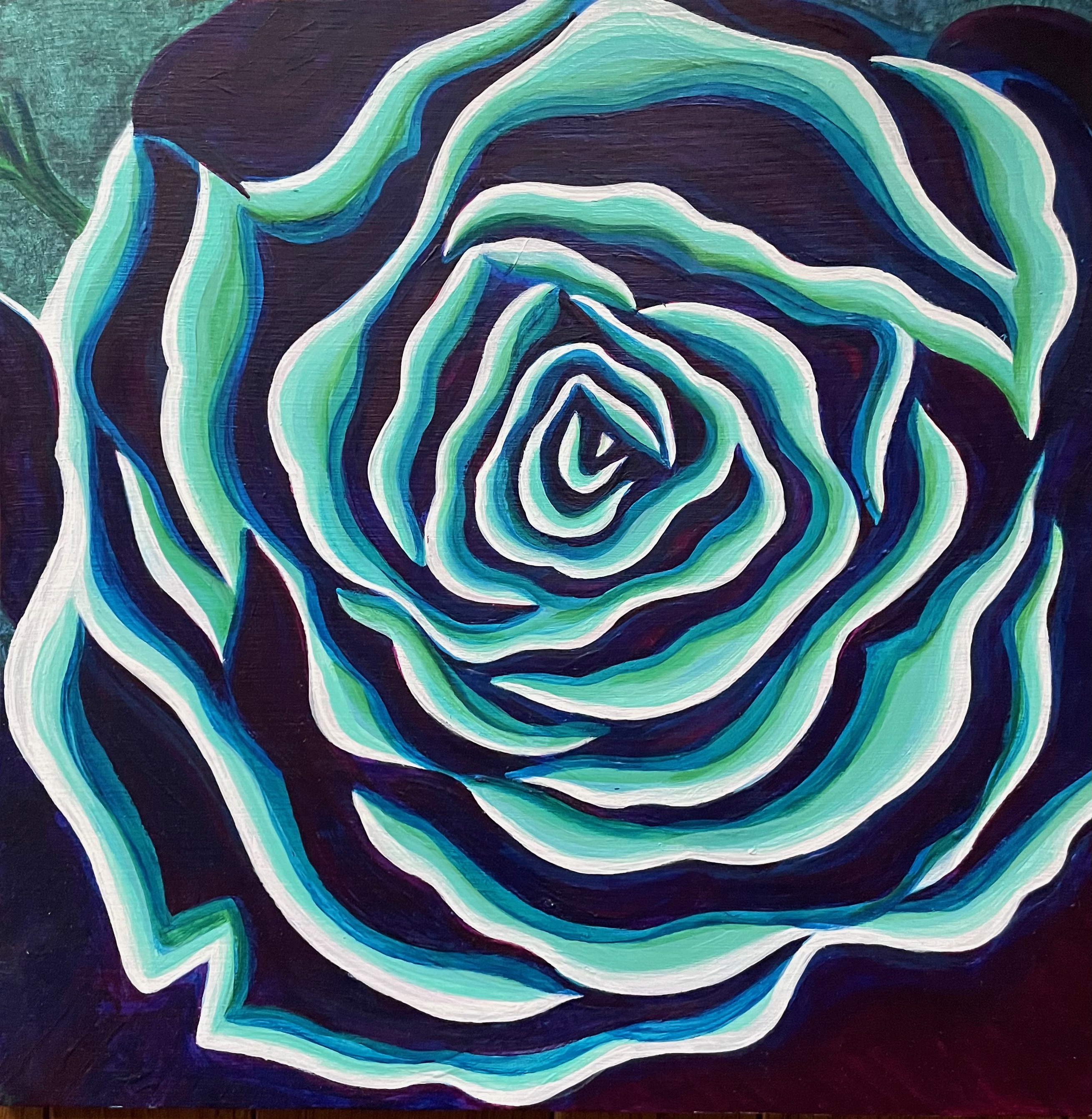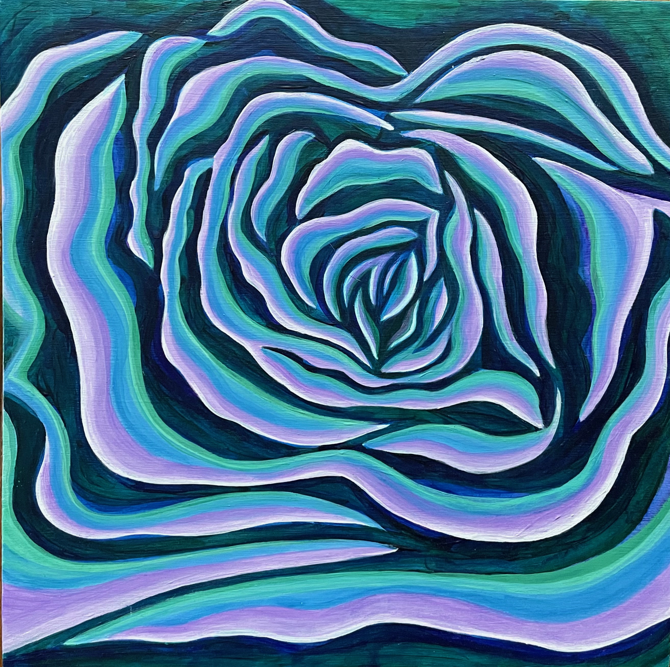 6. A rose is infinite. Eight of the twelve paintings are of roses. Seven take inspiration from the same rose. I studied it. The layers. The edges. The intimate core. The internal depth and outward display. My rose was dry, frozen in time, open yet closed, revealing yet hiding its depths. In my paintings, bands of color like topographical maps trace the world of a rose – one that rises and recedes, circles and contains. Roses are mountains – the deepest center the highest peak. Roses are waterfalls – cascading into whirlpools below. Roses are portals into the source of life. Roses are unfinished journeys.